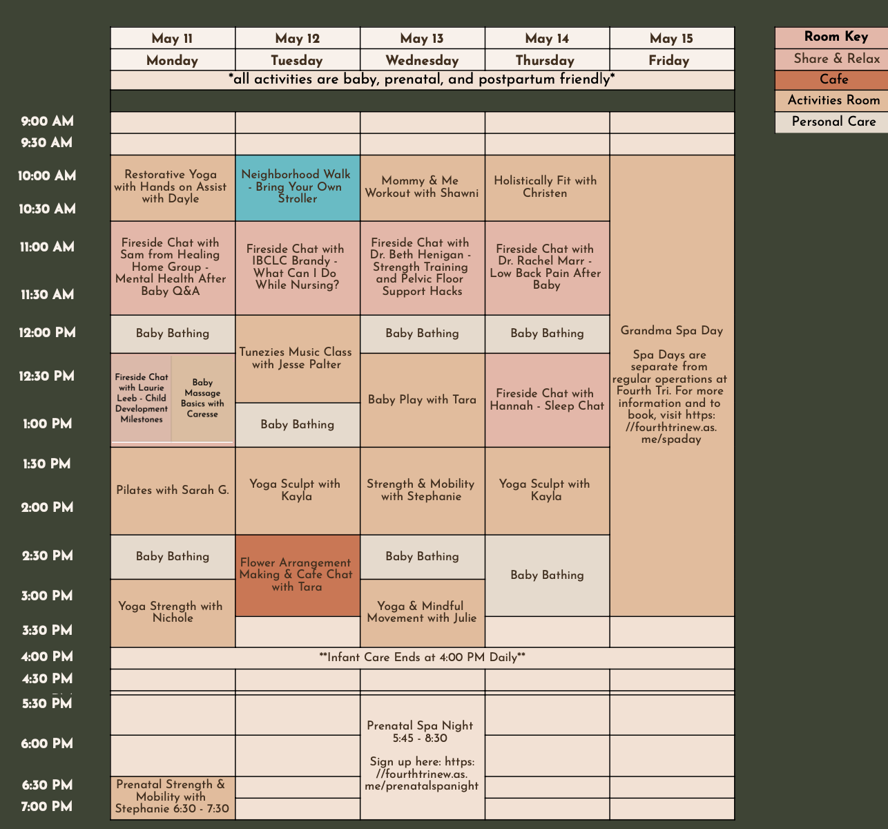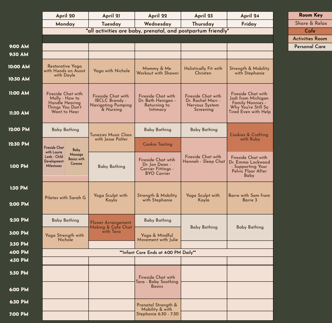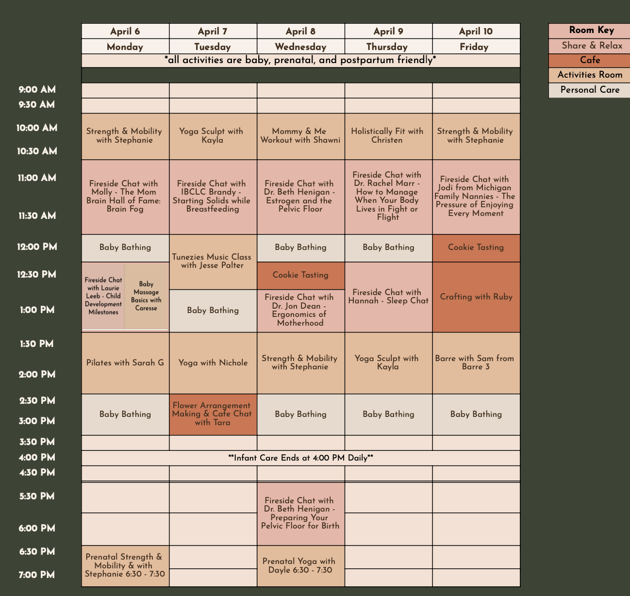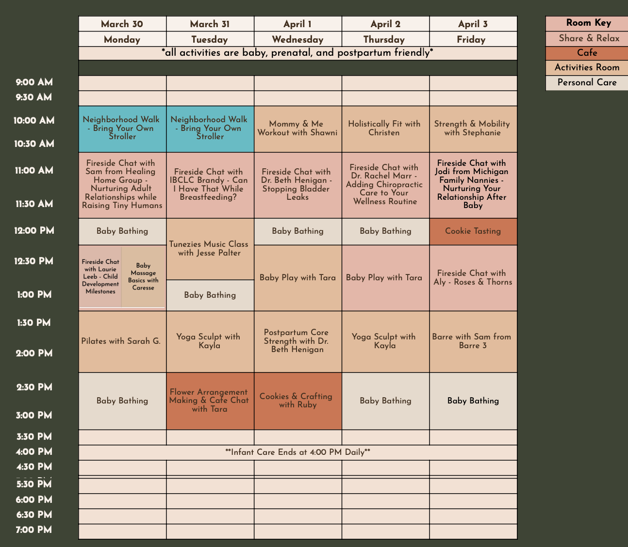 All activities are included with memberships. Take as many (or as few) as you’d like. Activities are designed to be enjoyed with your baby. However, infant care is available if you'd like some time to relax or focus on yourself.