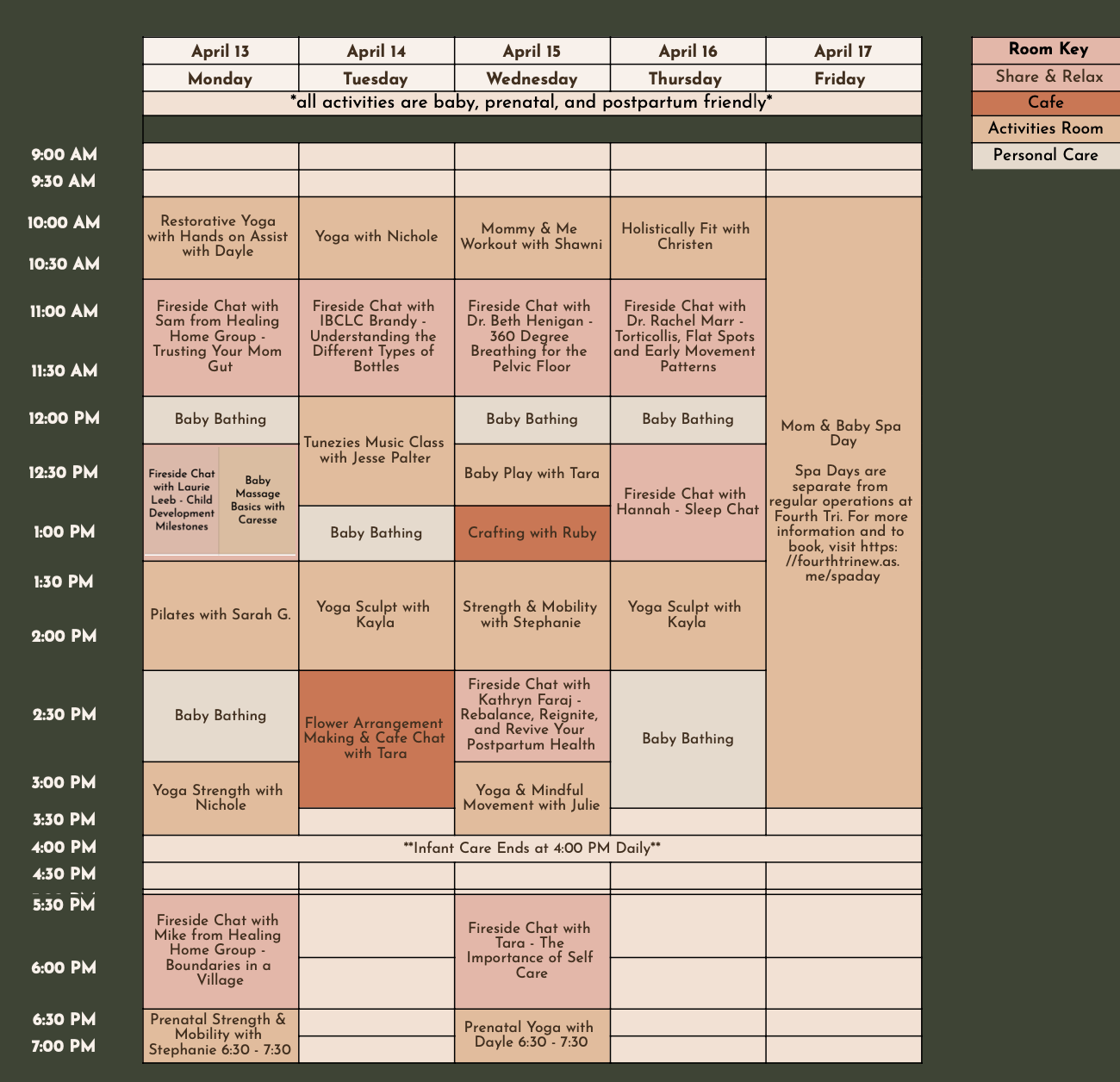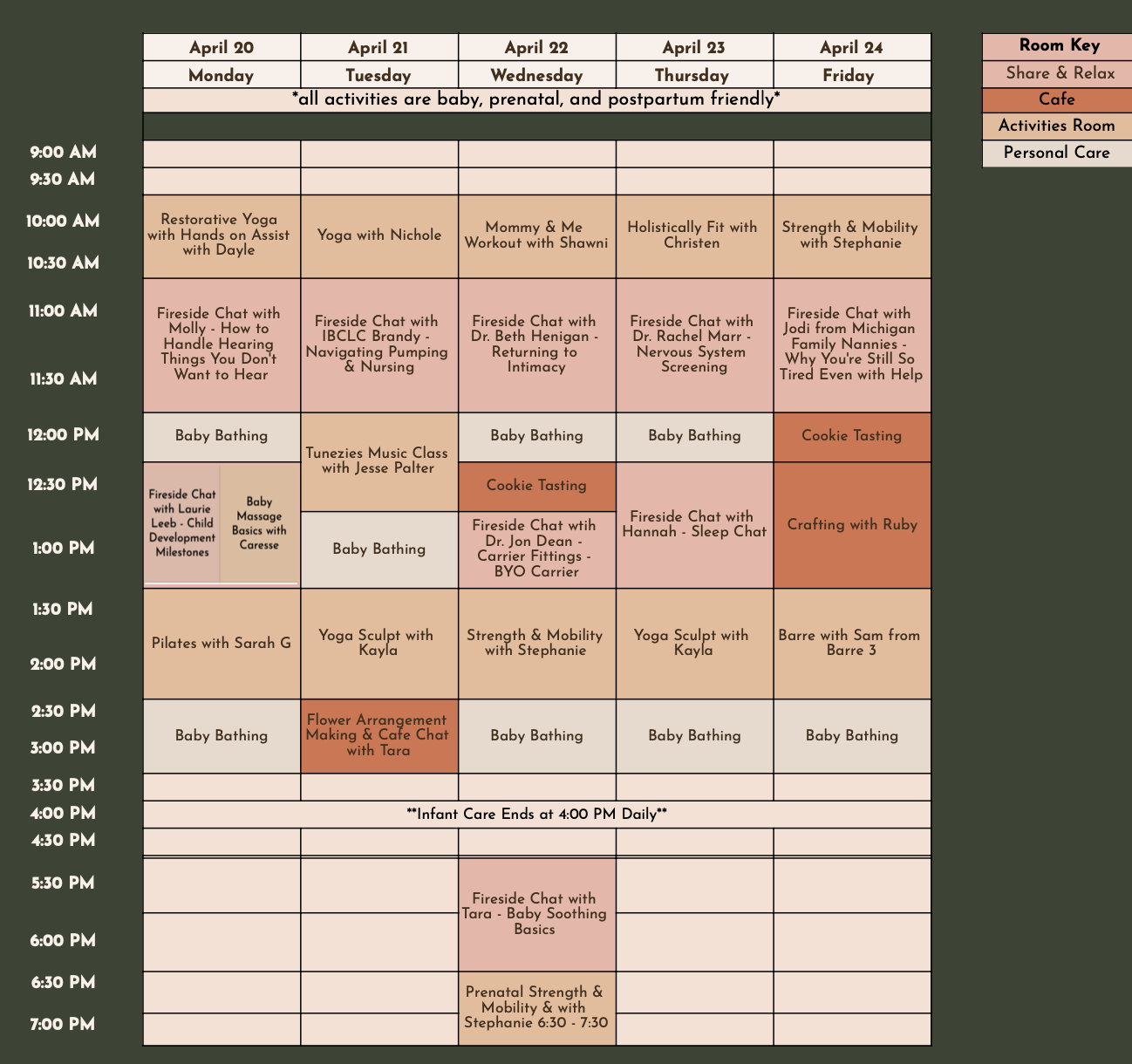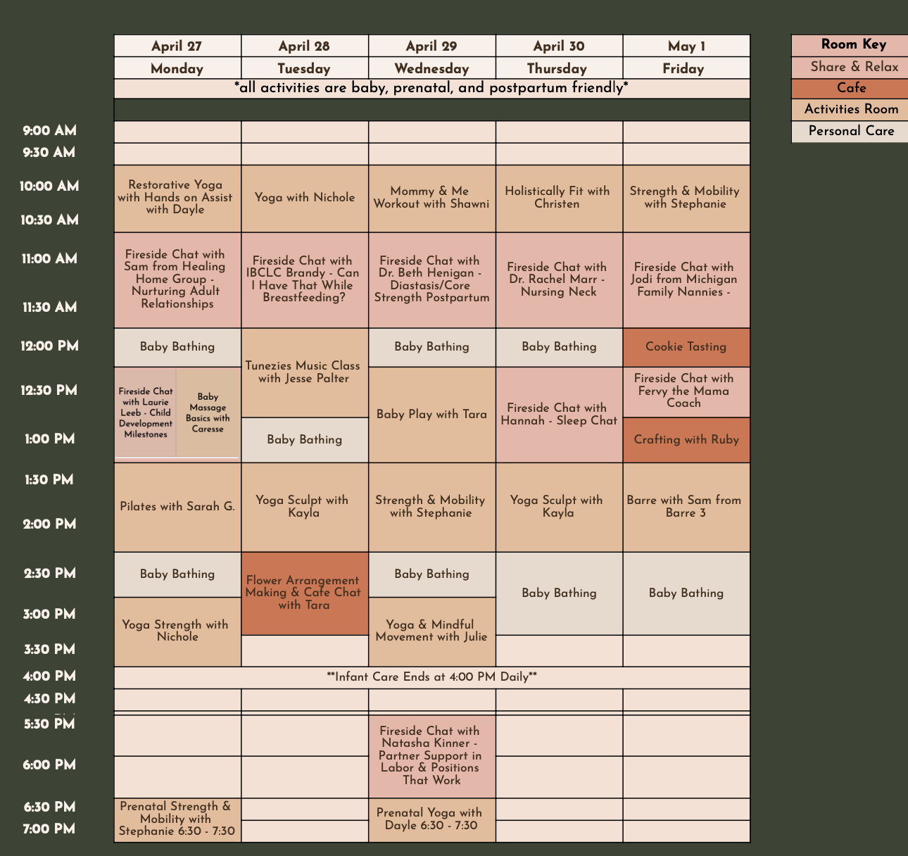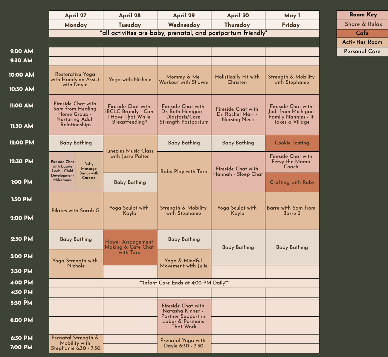 All activities are included with memberships. Take as many (or as few) as you’d like. Activities are designed to be enjoyed with your baby. However, infant care is available if you'd like some time to relax or focus on yourself.