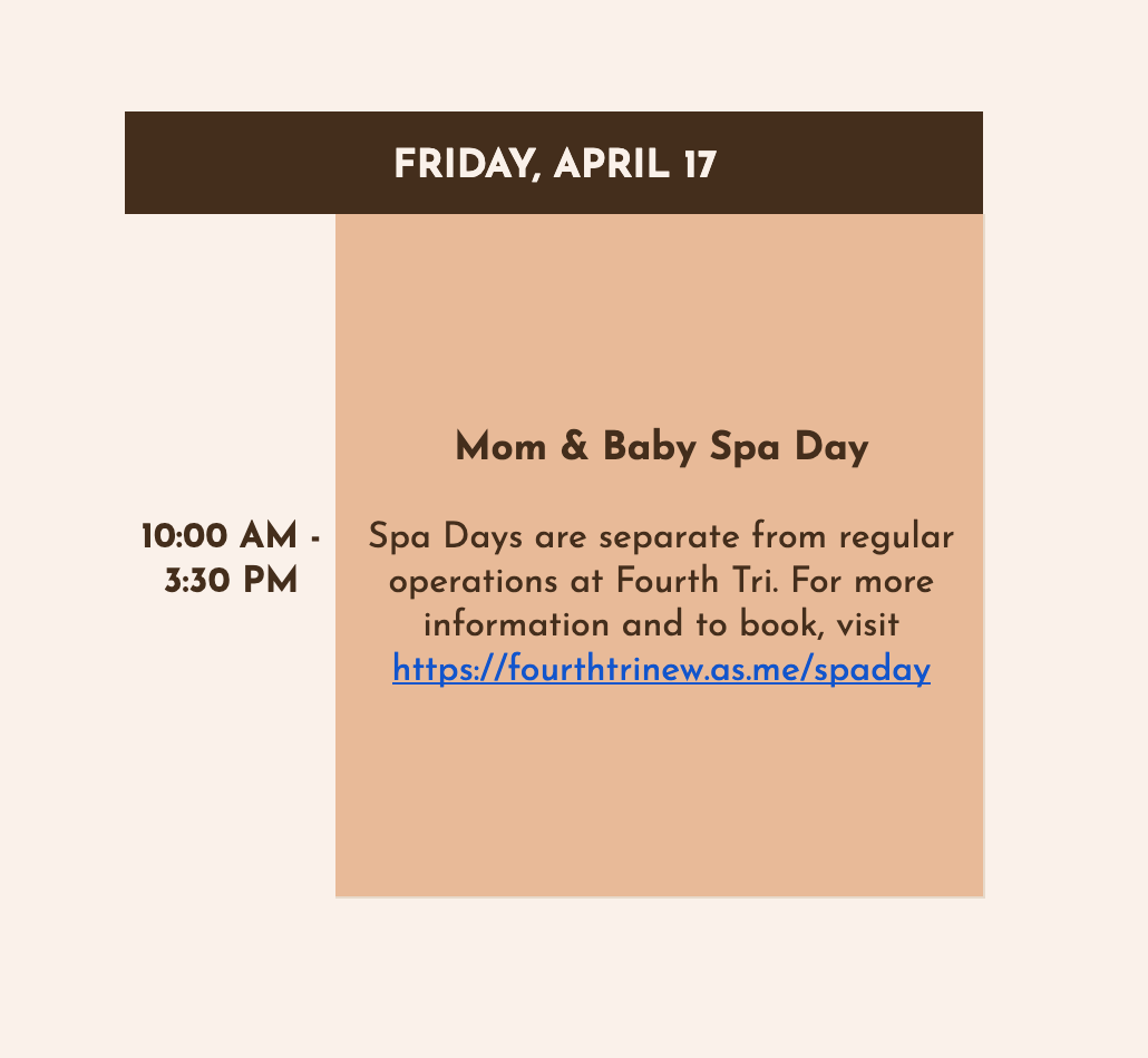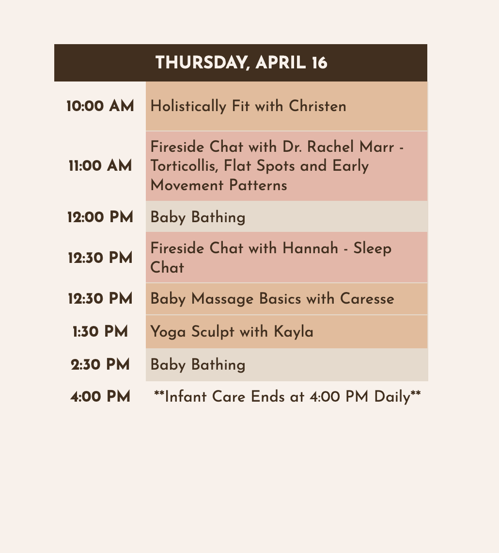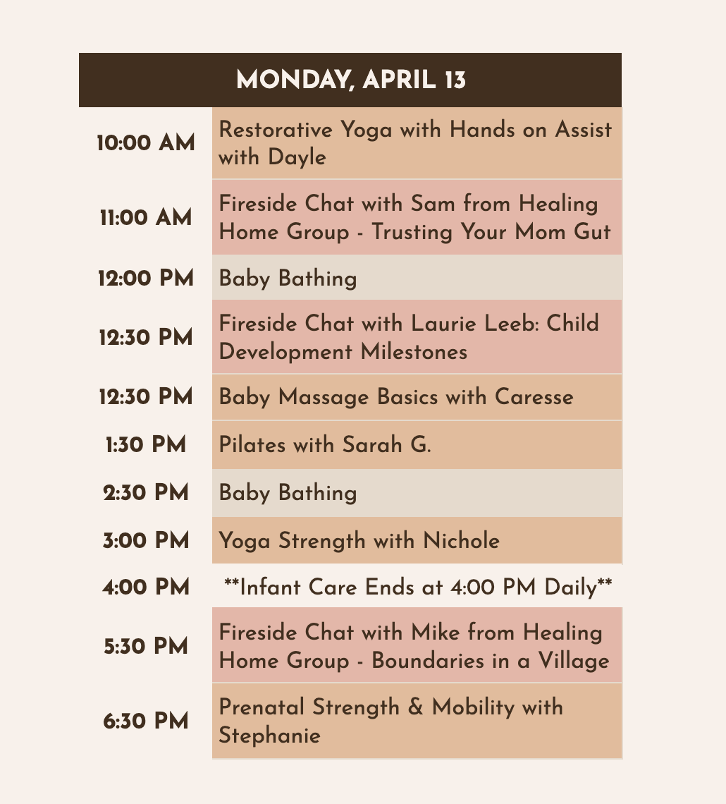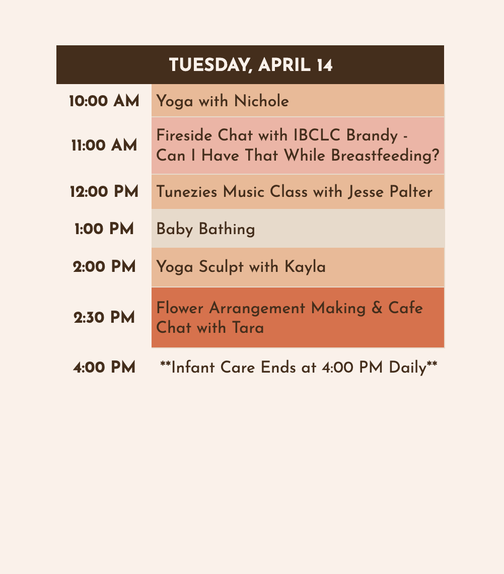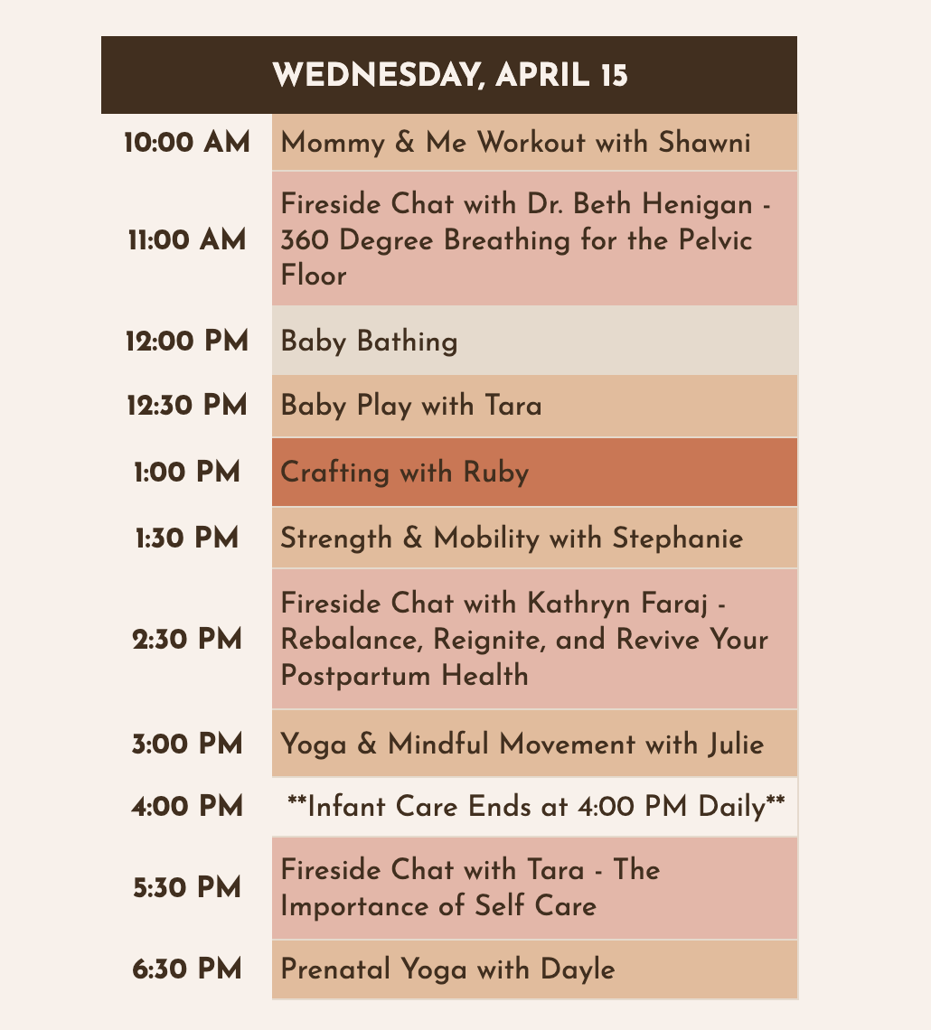 All activities are included with memberships. Take as many (or as few) as you’d like. Activities are designed to be enjoyed with your baby. However, infant care is available if you'd like some time to relax or focus on yourself.